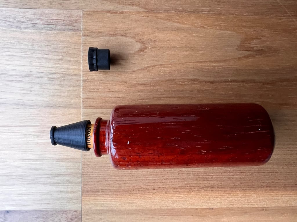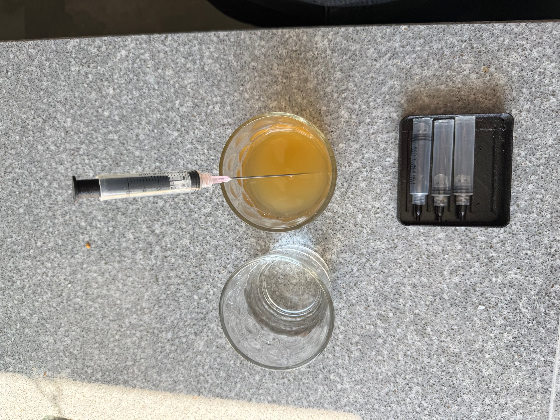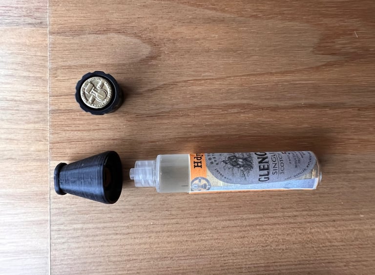 Prepare : Refill tool (Black cylindrical tool with protruding metal wires) , Refill needle (Pink), Empty cartridge, Glass of Clear water, Liquid to refill (e.g. Whisky, Porto, Coffee, etc.)