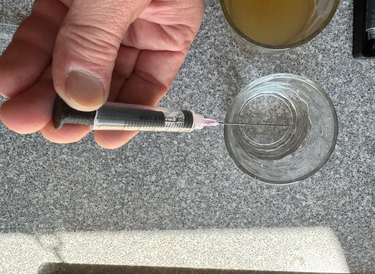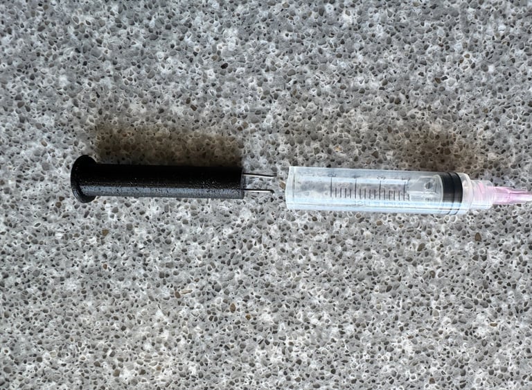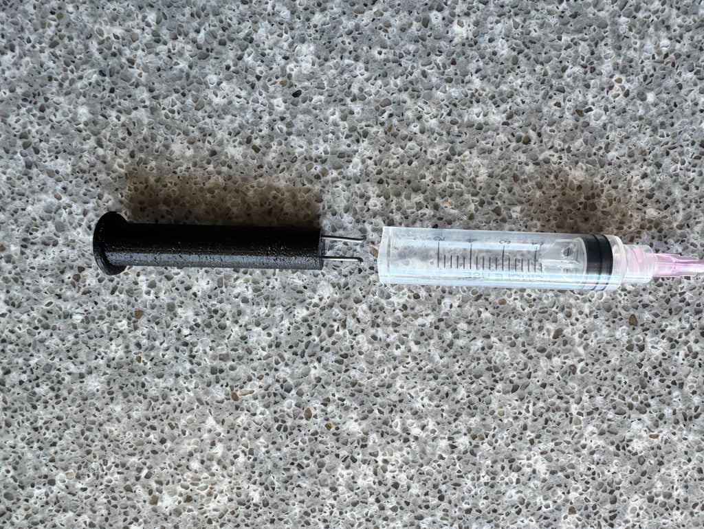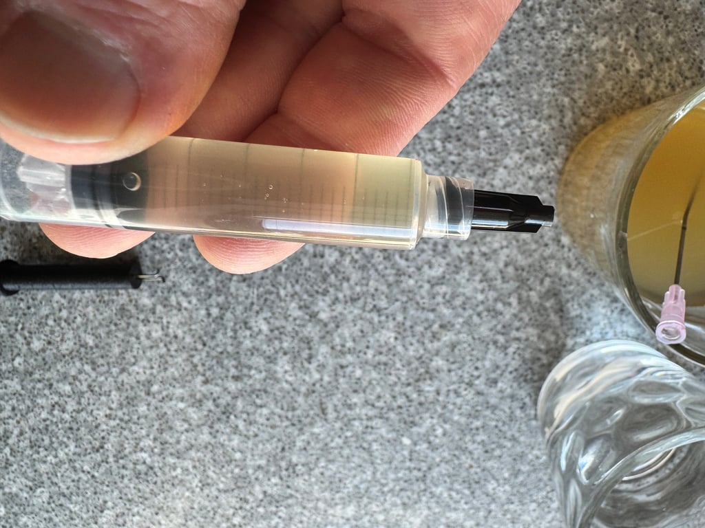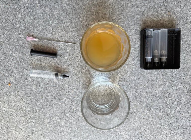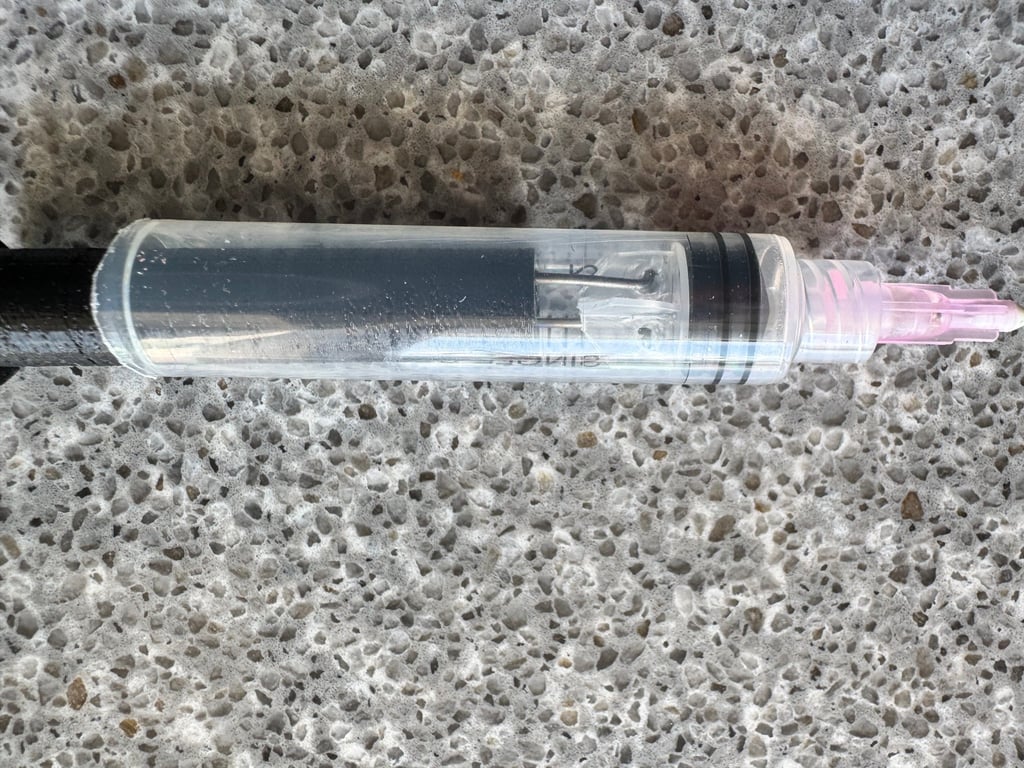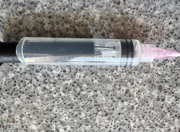 Prepare the empty Hdyon Cartridge by inserting the pink needle and the refill tool. Rinse the cartridge with clear water