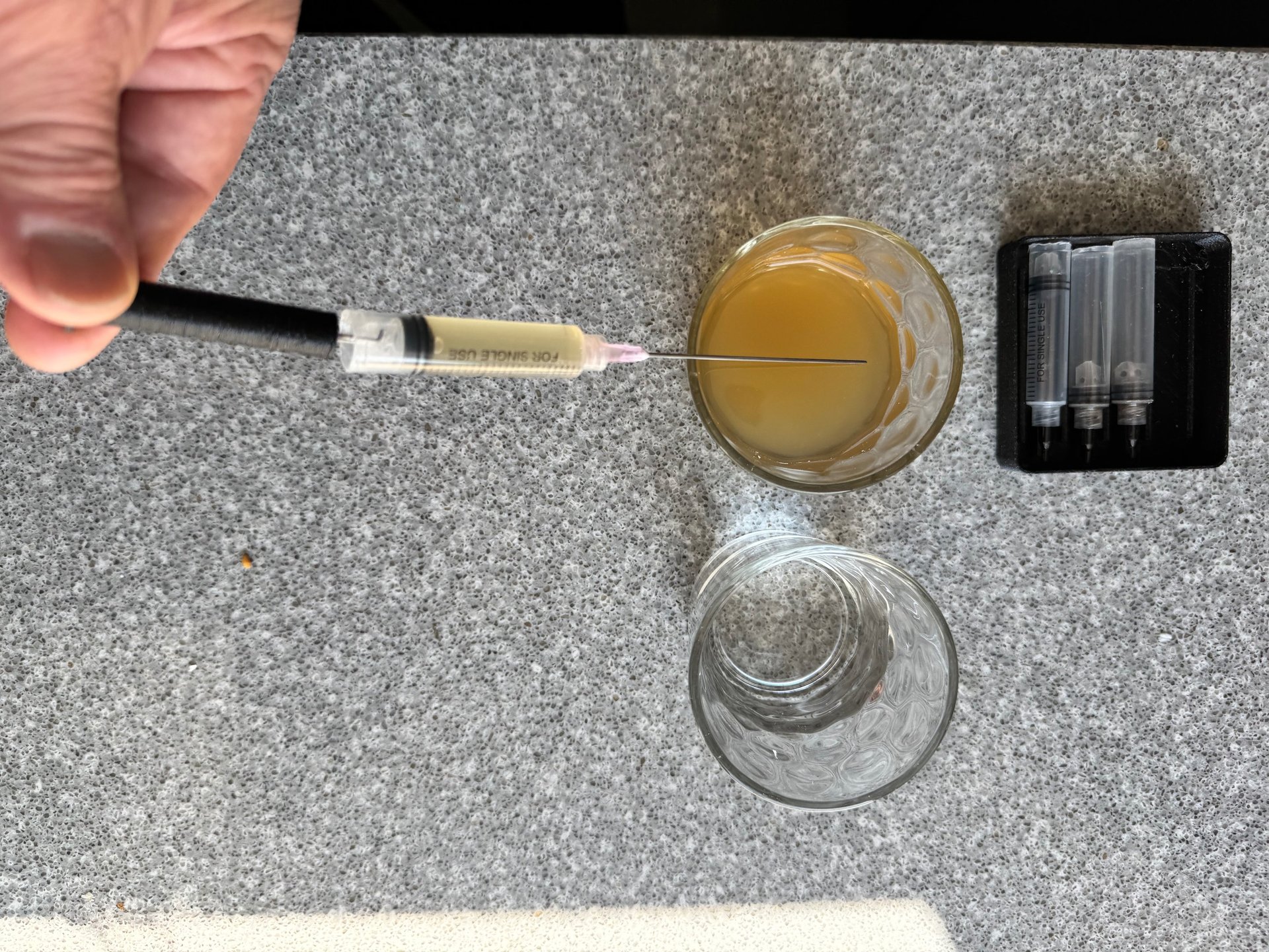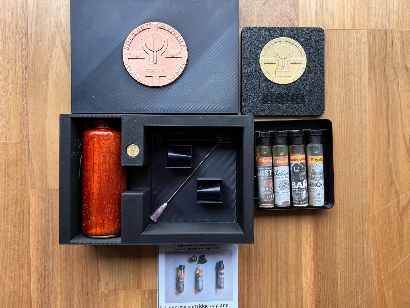 Prepare : Spirits Bottle, HdyonN Kit, Empty Cartridges, a glass of clear water, a glass of chosen spirit or wine